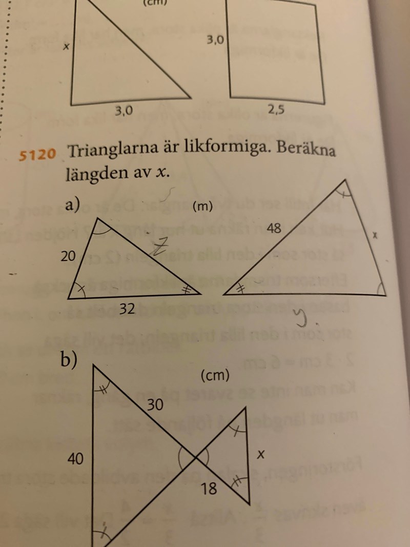 OBS: Löste den själv… Hade suttit alldeles för länge med den och glömde kolla på vinklarna. Jag tog x/20 = 48/32, löste därefter den ekvationen och sedan fick jag rätt svar!