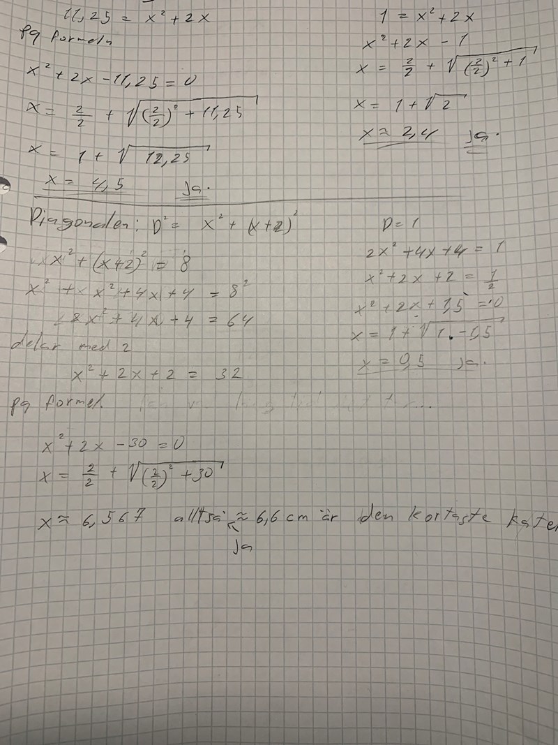 Med D = 8 får du alltså 82 = x2+(x+2)2. Du glömmer att kvadrera 8.