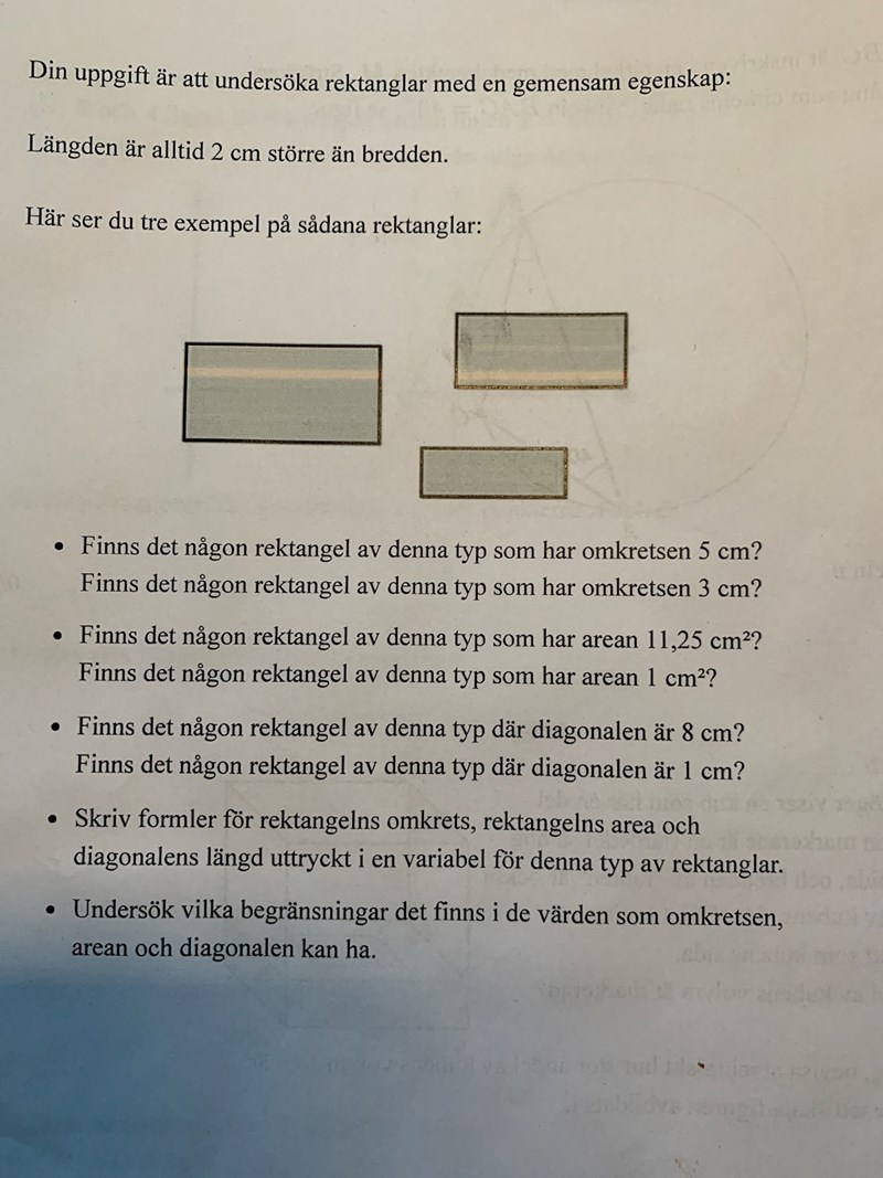 För en rektangel med de givna egenskaperna gäller att om breddden är x cm så är längden x+2 cm.