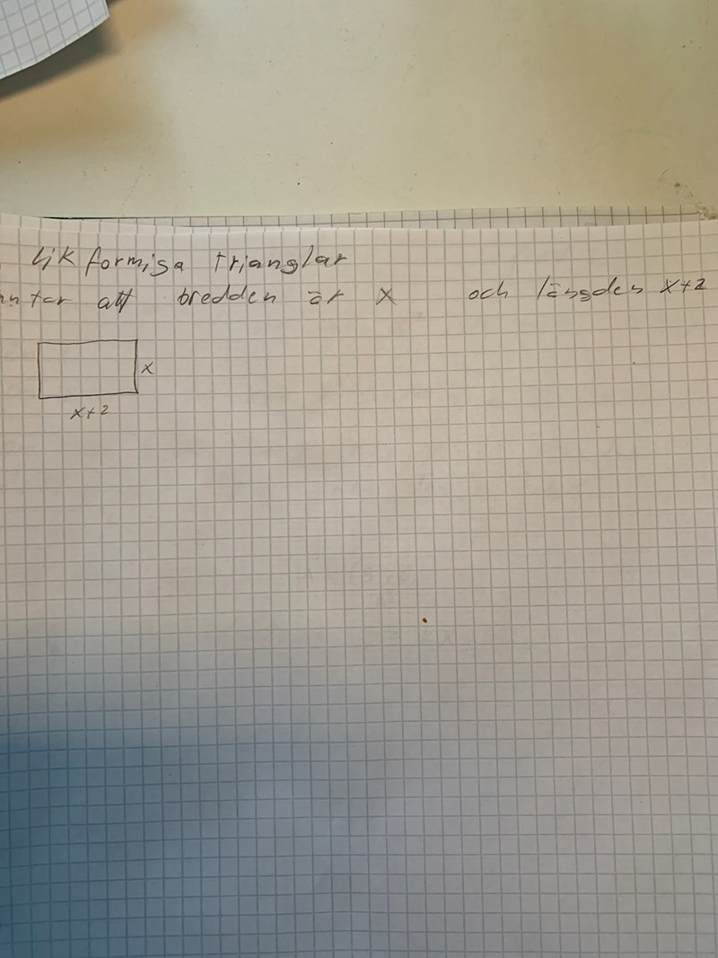 I övningsprov finns det en uppgift som jag inte förestår. När jag läste ( gemensam egenskap tänkte jag likformiga trianglar… jag har tre st. Jag antar att första har bredden X och längden X+2