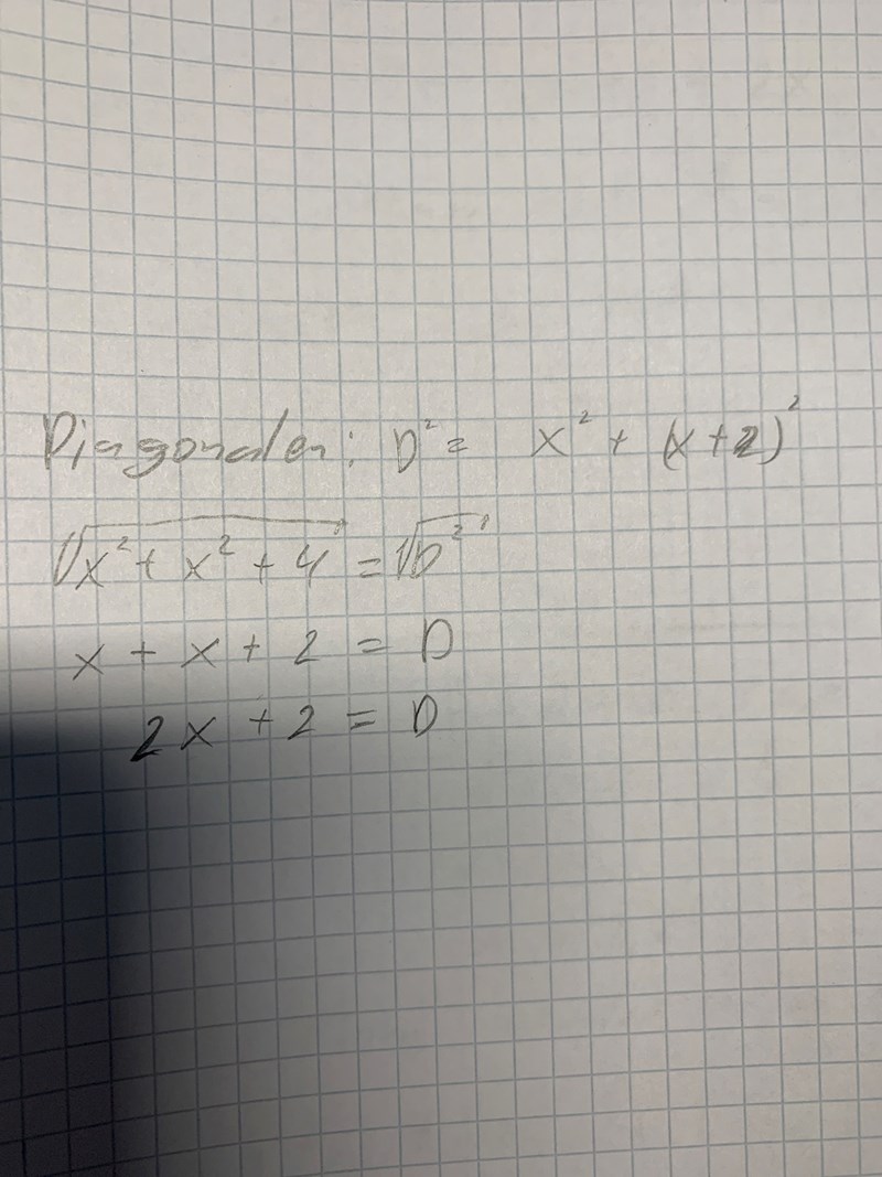 När du räknar på diagonalen så är ekvationen D2 = x2+(x+2)3.