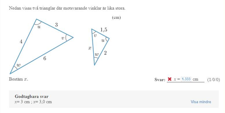 Först behöver du "vända" trianglarna så att de är på samma håll så att du kan skriva förhållanden mellan sidor korrekt.