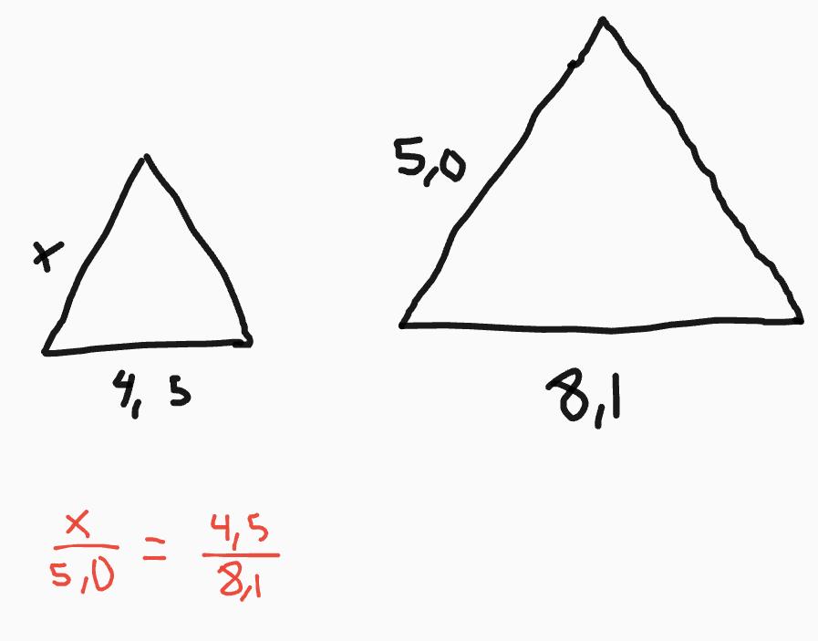 Kolla bilden igen: 5,0 är inte längden på hela sidan i den stora triangeln. utan det du kallar x. Men annars är det precis vad som ska göras.