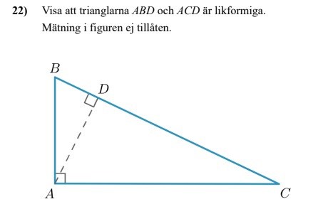Den lilla triangeln ABD har vinkeln B gemensam med triangeln ABC. Således har vi ABD~ABC . Triangeln ADC har vinkeln C gemensam med triangeln ABC. Således har vi ABD~ABC~ADC varav följer ABD~ADC