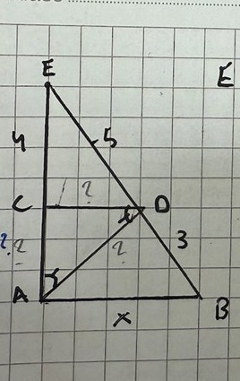 Kalla CD för y. Då är y/x=5/8. Men p g a de utritade lika vinklarna vid A och D så är även CA=y. Så då är  4/(4+y)=5/8, vilket ger y=2,4. Insättning i första sambandet ger x=3,84