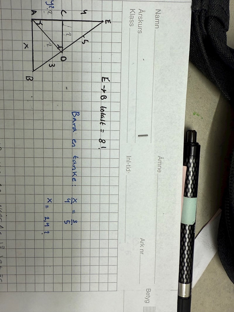 Det finns väl en mening med att det finns en likbent triangel inskriven och att den är parallell med sträckan x därav måste man väl lösa ut CD istället för AC, då det inte är säkert att längderna är detsamma om det är lik belägna vinklar.