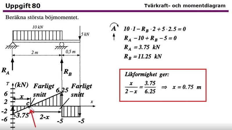 Jag vill ta reda på hur långt i x-led punkten c ligger. x/2-x förhåller sig på samma sätt som 3.75/6.25 gör, hur beräknar man x till 0.75 här?
