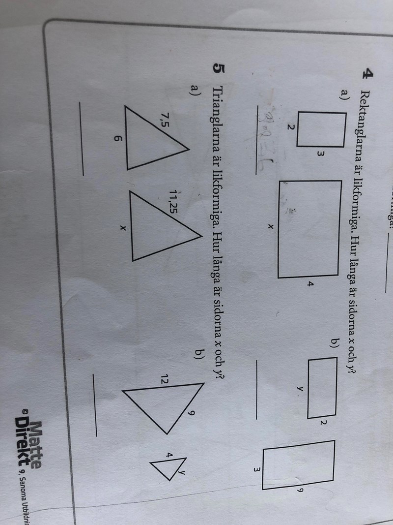 Likformiga figurer har samma förhållande mellan sidorna. Vi kan beräkna att den större sidan ska vara gånger större än den lilla sidan. Eftersom figurerna är likformiga gäller detta för alla sidor i figuren. Det innebär att . Vad är då x?