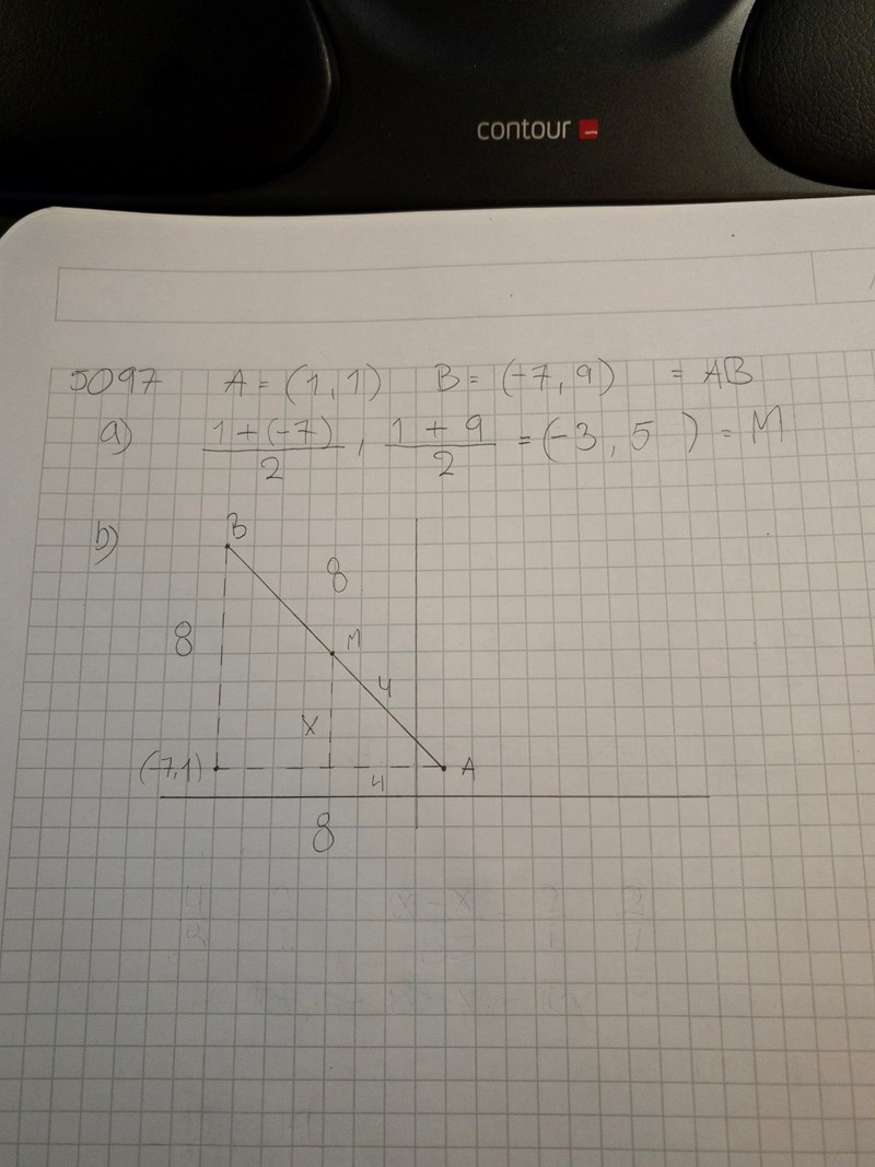 a) Bestäm koordinaterna för mittpunkten M. Denna var inga problem.