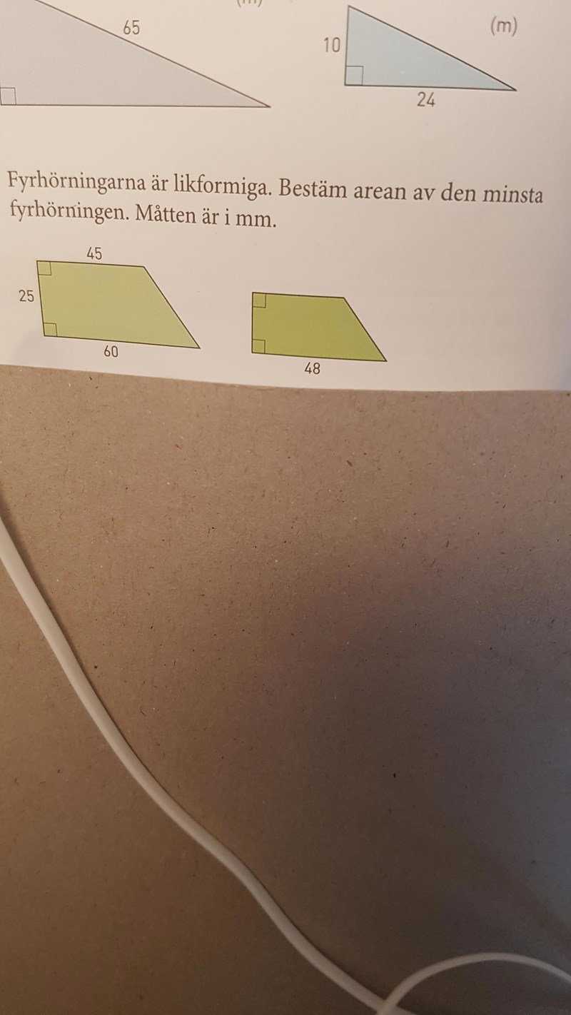 För att räkna ut arean på fyrhörningen kan du dela upp den i en rektangel och en triangel. Om du tittar på den stora så kan du dela upp den i en rektangel som är 25*45 mm och en triangel som har höjden 25 mm och basen 60-45=15 mm. Tänk likadant med den lilla!