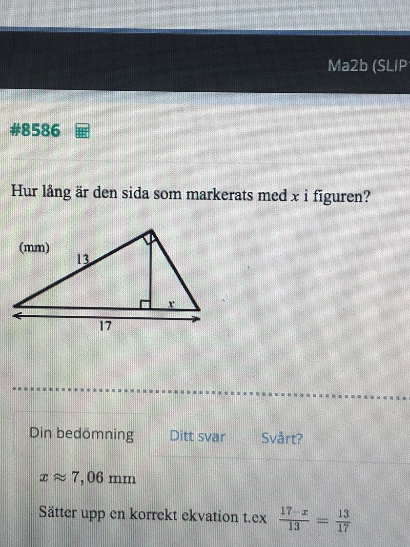 Det är en lite krånglig figur men eftersom du har en början till svar så är det inte så svårt. Föreslår att du delar upp triangeln i två för att lättare se om de är likformiga. Låt den stora triangeln vara kvar och rita och vrid den lilla, den som består av 17-x och 13, så den ser ut som den stora d.v.s. att 90 grader ligger på samma plats. Läs gärna i Matteboken.se om Likformighet när du ritat om figuren.