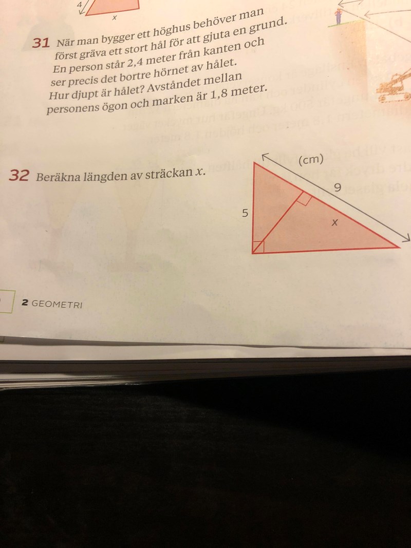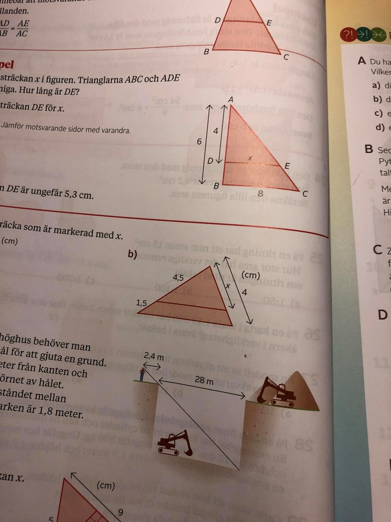 Behöver lite hjälp med B uppgiften med den likformiga röda triangeln. Så hur jag gjorde: X/4 = 1,5/4,5. Detta kan skrivas som 4 gånger 1,5/4,5 vilket är 6/4,5. Detta blir 1,3333... Borde inte detta vara svaret? Det står 3cm i facit? Ska jag subtrahera 1,3 ur 4 för att få 2,7 och avrunda det till 3???