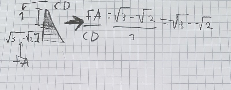 Det du ska tänka på är att under tiden du har resonerat dig fram till svaret så har du också diskuterat vilken enhet olika sträckor och areor har. Du har använt ordet "areaenheter", i någon anteckning såg jag cm och cm^2, och att "sträckan FA är roten av 3 subtraherad med roten av 2" .