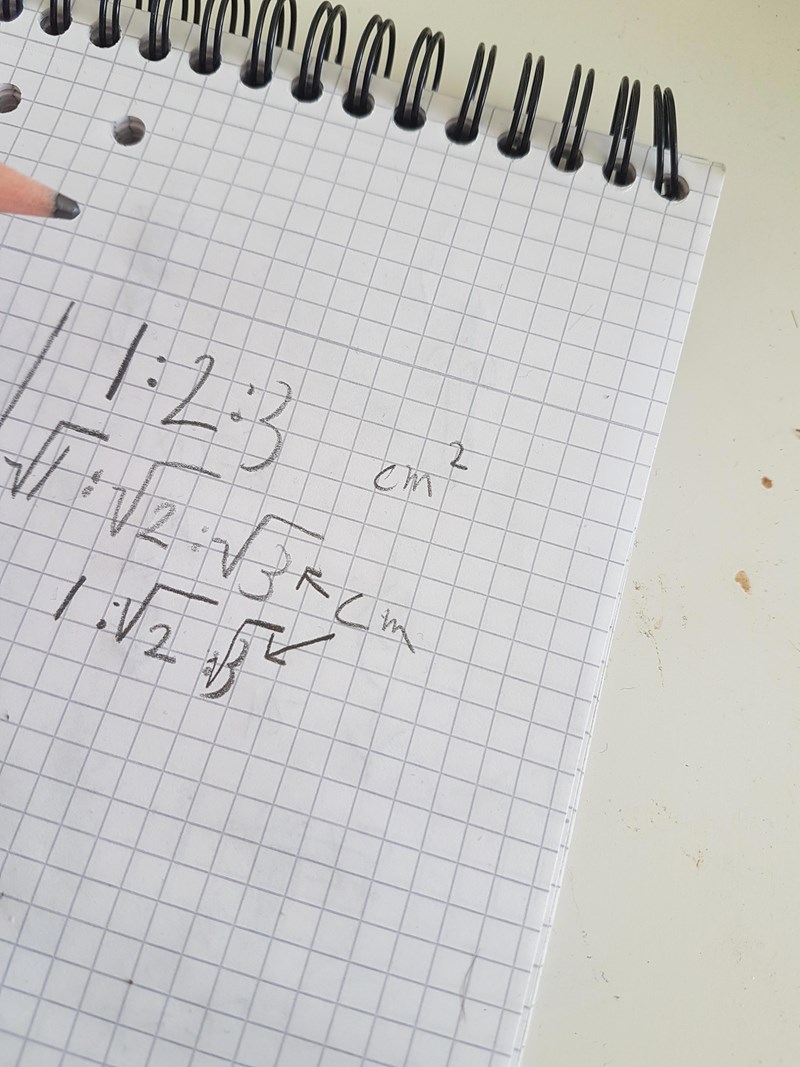 Sträckorna? Eftersom sträckor är en dimensionella så blir den hära area skalan 1:2:3 till deras kvadratrötter