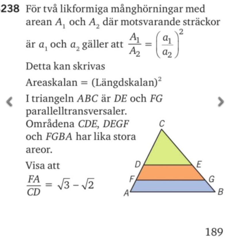 Jag kom på något@ .. Eftersom Triangeln CDE och fyrhörningarna DEGF FGBA har samma areor det vill säga 1:1:1 (area enheter) så betyder det att triangeln ABC är 3 gånger så stor (inom area) som triangeln CDE för den har dem 3 areorna. Och triangeln CFG är 2 gånger som stor (Inom area) som CDE för den här dem två yttre areorna.