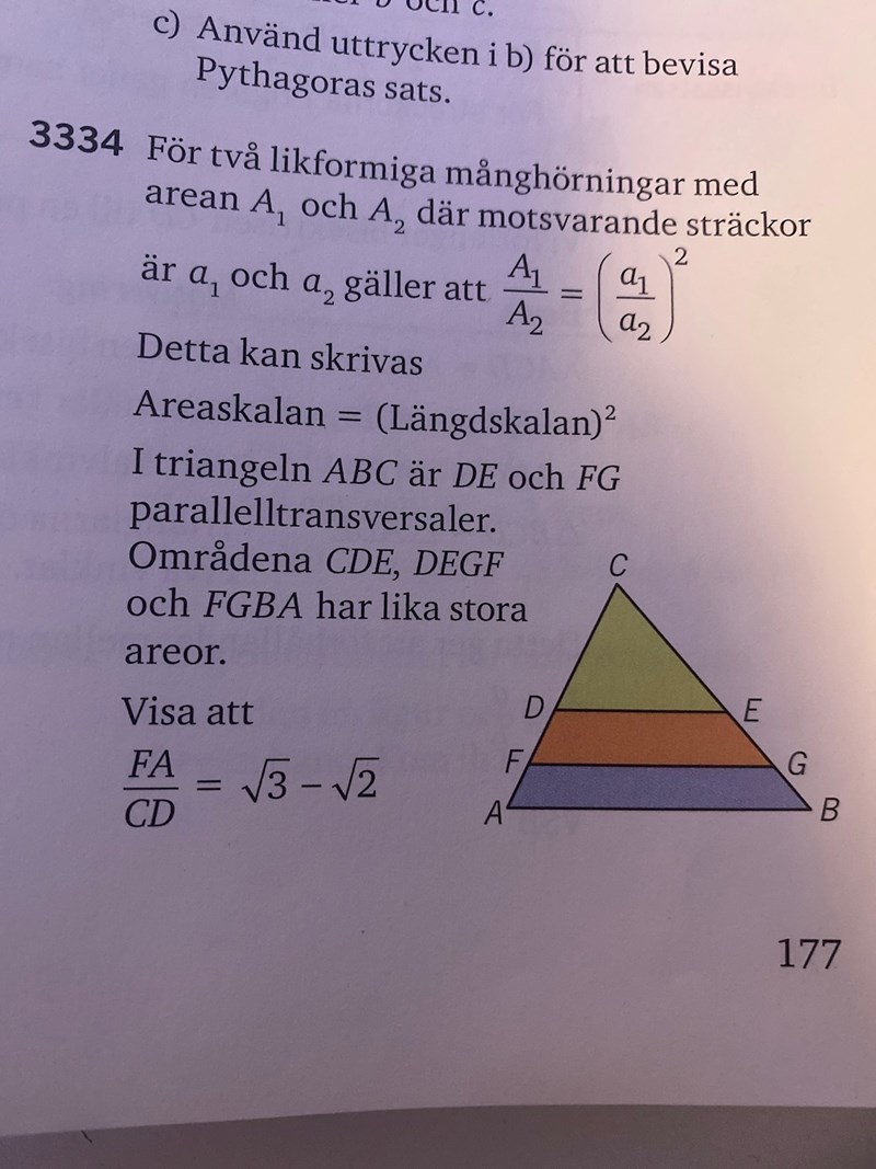 Eftersom de tre trianglarna är likformiga så gäller det som står i uppgiften om likformiga månghörningar, nämligen att och att