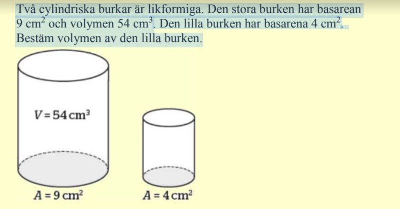 Men nu när jag har funderat lite har jag insett att jag kunde ha använt mig av volymskala. Areaskalan mellan dem är 1:2,25. Sedan blir väl längdskalan 1:1,5. Sedan förstår jag inte hur jag skall lista ut volymen på den lilla cylindern... Kan nån hjälpa. Har jag gjort rätt hittils?