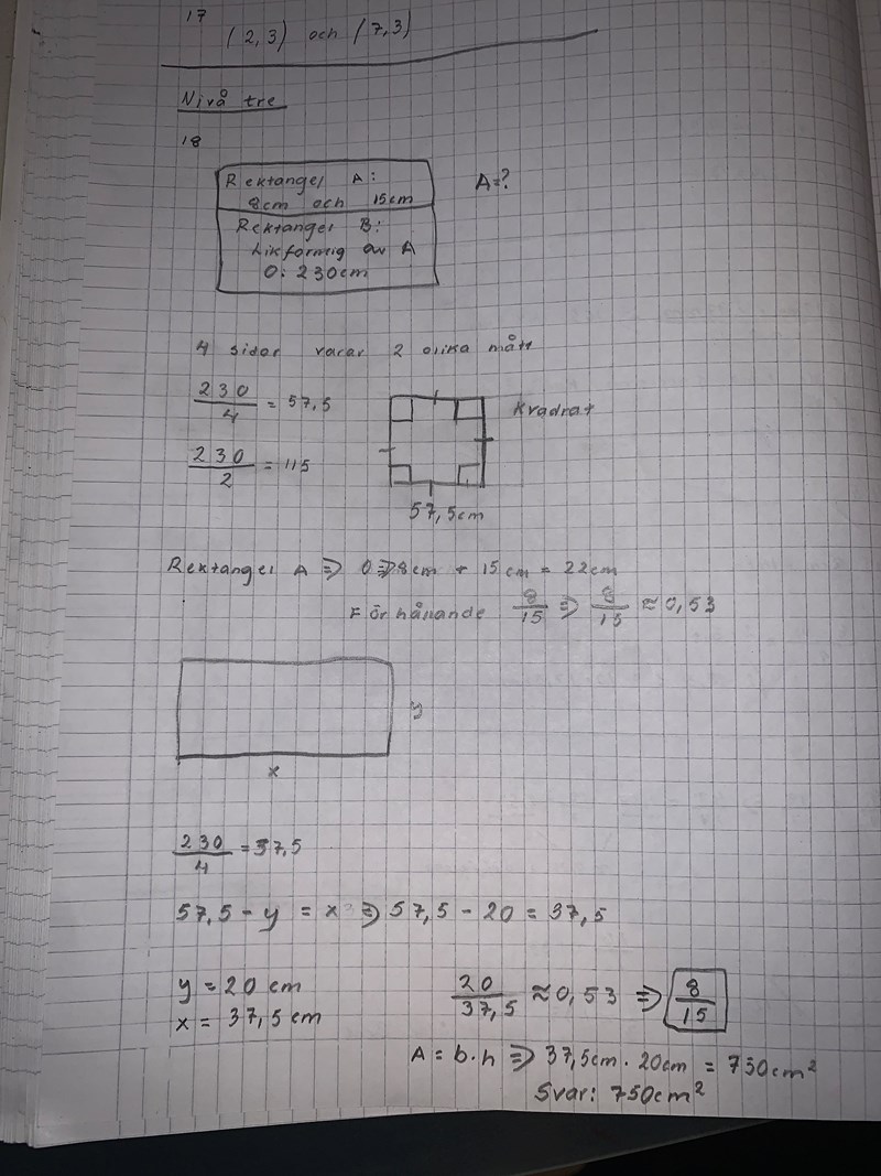 Omkretsen i den andra rektangeln kan skrivas 230 = 2x + 2(8/15x). Den längre sidan kallar vi X, och den kortare sidan förhåller sig till X som den längre sidan till den kortare i den första rektangeln (dvs 8/15). Sedan är det bara att multiplicera alla termer med 15, som ger 30x + 16x = 3450 ==> X=75 (den längsta sidan i den andra rektangeln).