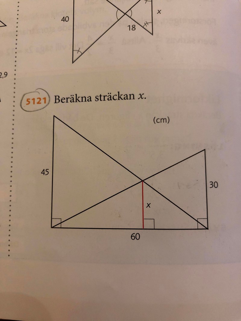 har försökt att räkna ut X på denna uppgift ett tag nu. Tror mig förstå att man ska addera ihop 30 med 45 för att få fram hypotenusan, genom tanken katet+katet=hypotenusa.