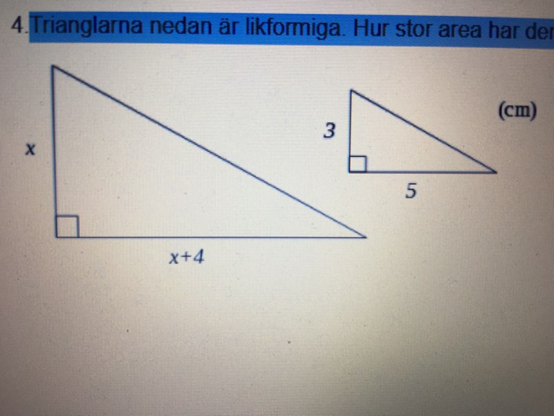 Trianglarna nedan är likformiga. Hur stor area har den större triangeln?
