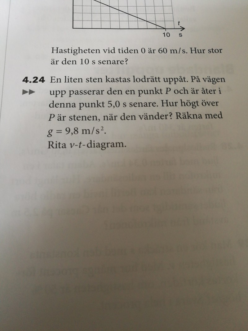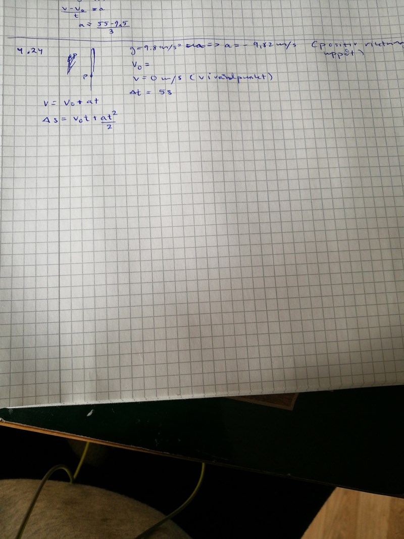 Vet inte riktigt hur jag ska ta mig an uppgiften. Har skrivit upp den fakta jag vet, men är inte riktigt säker på att jag placerat all fakta rätt. Jag utgick från att positiv riktning är uppåt, och antog dessutom att hastigheten i vändpunkten är noll. Hur ska jag gå vidare? Har bifogat både uppgift och min påbörjade lösning.