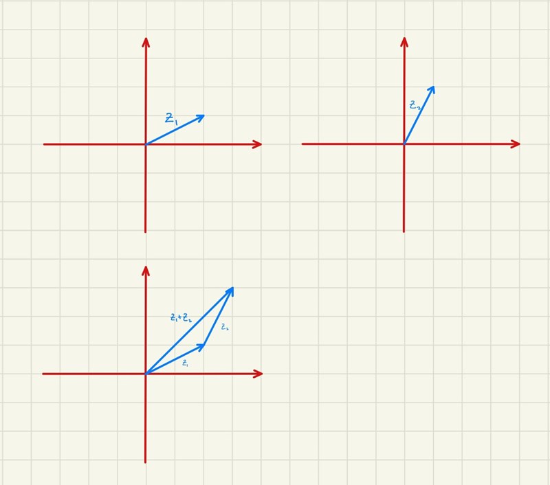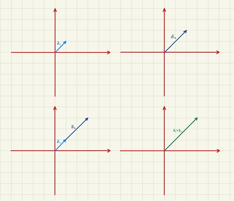 Den tredje figuren illustrerar z1 + z2. Vi ser i detta fall att |z1 + z2| < |z1| + |z2|.