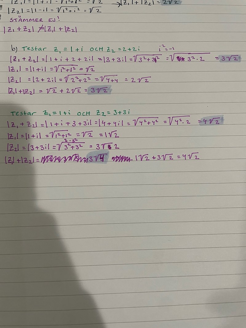 Stämmer likheten om z1 = 1 + i och z2 = 3 + 3i?