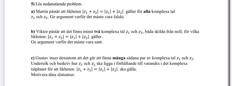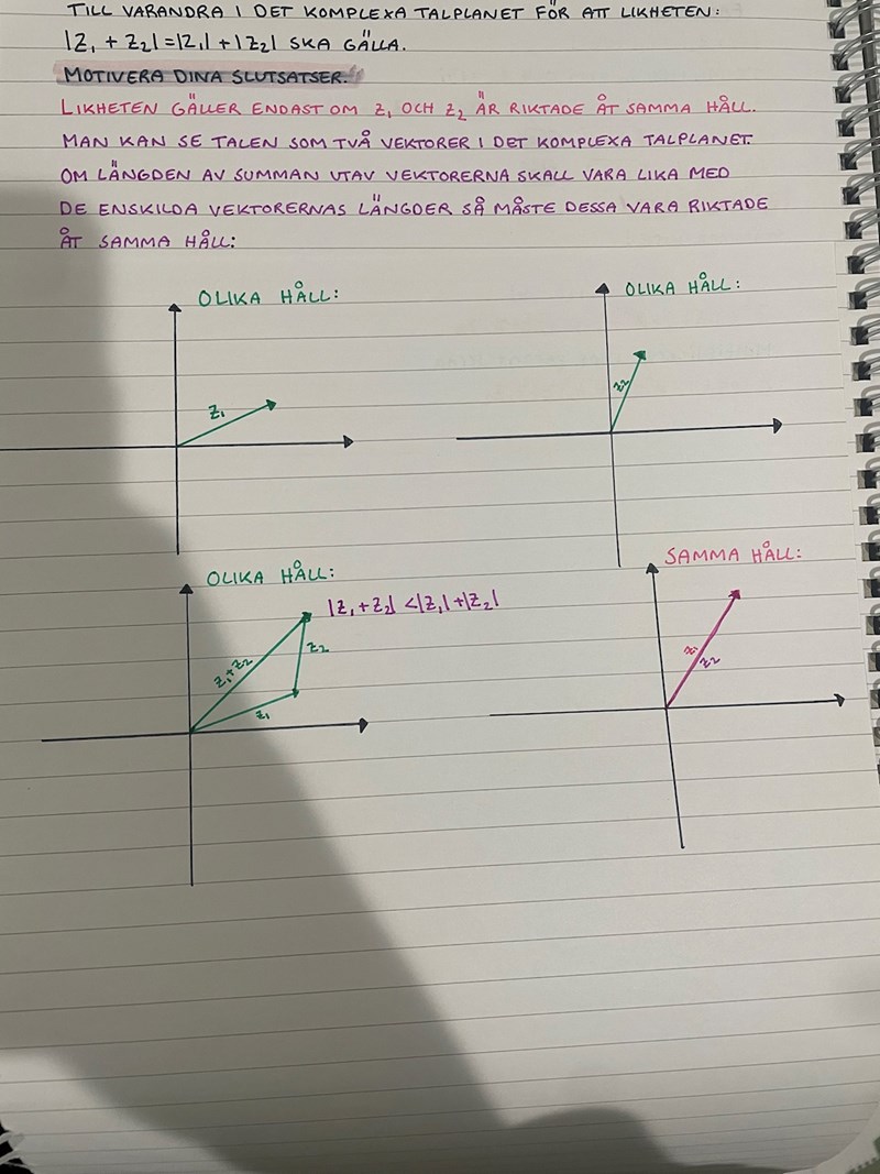 Sedan kanske man inser att likheten gäller om (och endast om) z1 och z2 är riktade åt samma håll. Du kan se talen som två vektorer i komplexa planet. Om längden av summan av vektorerna skall var lika med de enskilda vektorernas längder så måste dessa vara riktade åt samma håll. Om du ritar en figur så blir detta ganska uppenbart.