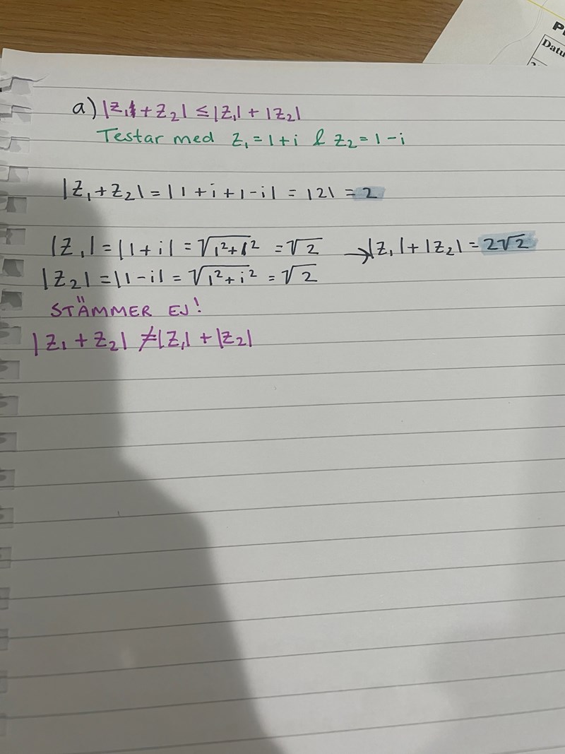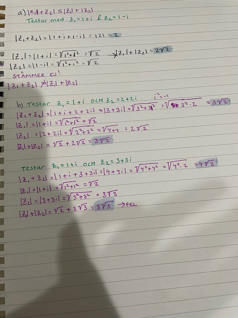 Jag har väldigt svårt att förstå denna fråga. Jag har börjat med a (se bild) och antar att dom menar att jag ska visa att likheten inte stämmer? Det gjorde jag genom att räkna den med 2 värden som inte blev samma. Stämmer det?