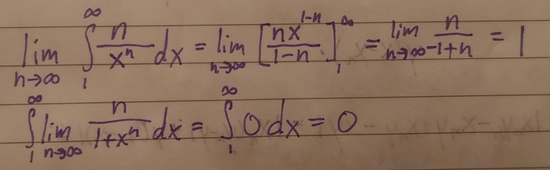 Ser nu att samma sak händer med den andra funktionen om jag tar in lim först. Men borde jag inte få det i en konvergent integral? 🤔