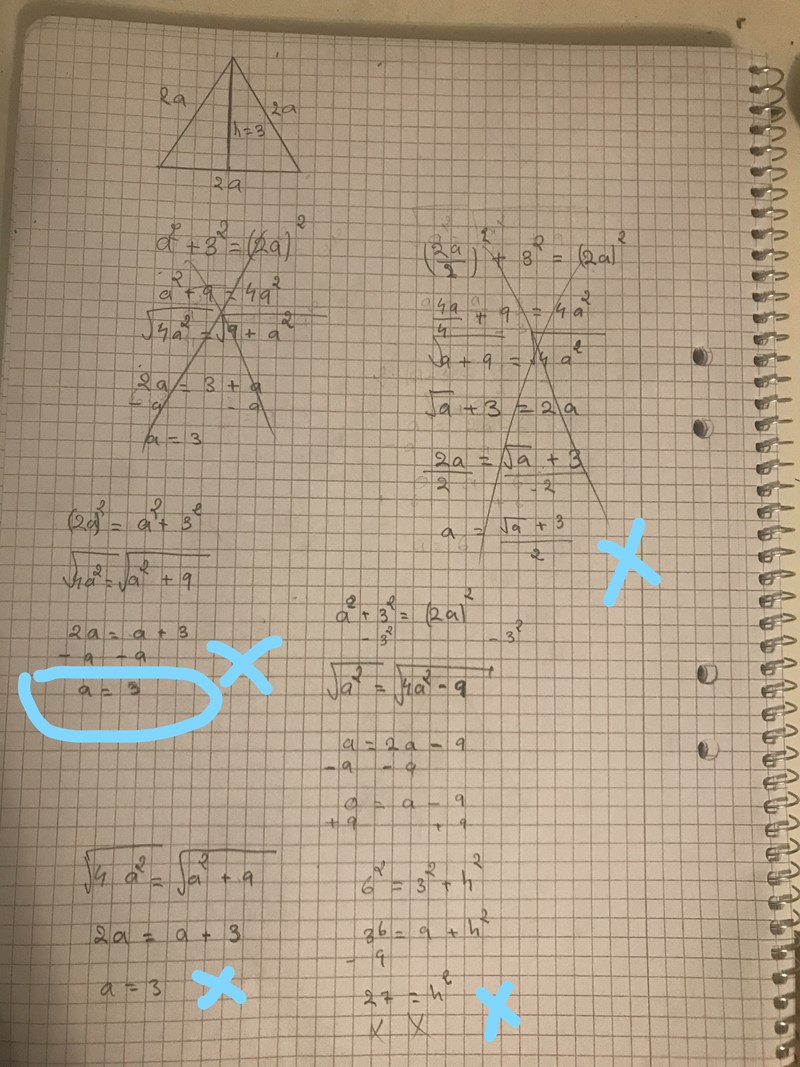 PeBo skrev:Du har nog nytta av pythagoras för att få reda på storleken på a. Tänk att halvan till höger med hypotenusan av längd 2a och de andra sidorna 3 (höjden i din triangel) och a (halva stora triangelns sida där nere). Enligt pythagoras har du