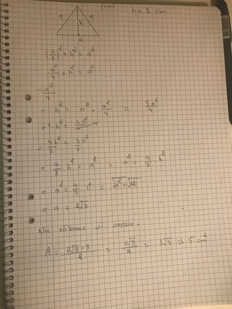 Frågan är : bestäm triangelns area om den är liksidig med höjden 3 cm.