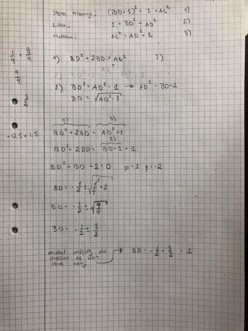 Då de två trianglarna delar två lika långa sidor samt en vinkel, är de likformiga. Jag försökte dock att ställa upp ett ekvationssystem för att lista ut BD och gjorde såhär: