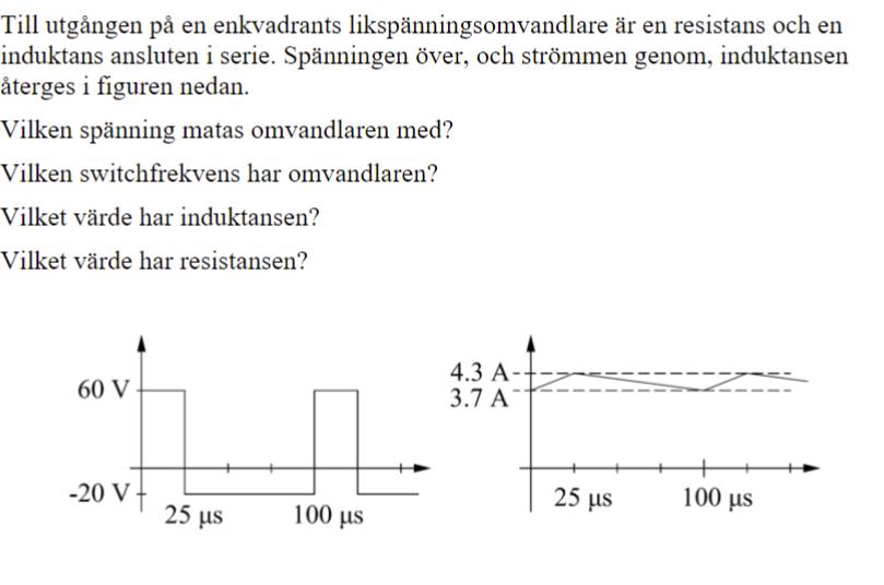 Blir den 20? När spolen driver strömmen tycker jag att spänningen är 20V enligt diagrammen. Hur ska jag tänka med strömmen? Det ser ut som att medelströmmen används i lösningsförslaget, alltså 4A. Hur kommer detta sig?