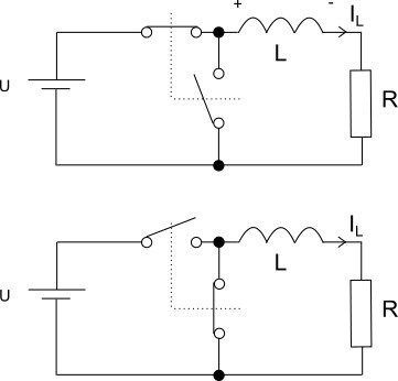 Omkopplarna växlar samtidigt. I första fasen är spänningsmatningen inkopplad och i andra fasen driver spolen en ström genom R.