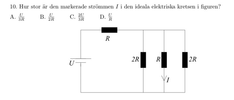 Svaret är A) U/3R men jag får fram det till U/R. För att göra det enklare har jag skrivit sökande strömmen som Iii . Uppgiften verkar inte vara så svår men förstår inte om jag har glömt något eller om jag har gjort fel någonstans. Uppskattar all hjälp!
