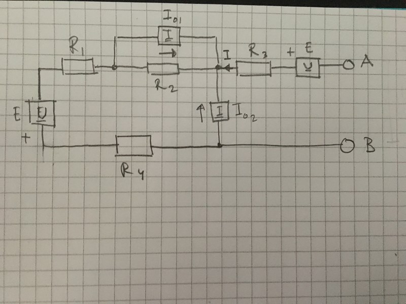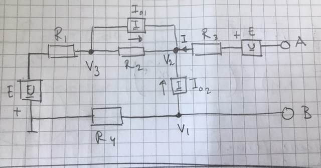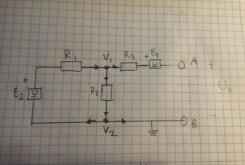 Yes, ska bestämma spänningen över A och B. Jag har räknat ut potentialerna för v1, v2 och v3.  Potentialen i B blir ju samma som i v1. Men sen för att få fram potentialen i A så är den: V2 + spänningen E + spänningen över R3? Och då måste jag ta reda på strömmen som går genom R3?