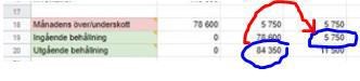Utgående behållning är den aktuella månadens över/underskott adderat med den aktuella månadens ingående behållning. I februari blir det därför 78 600 + 5 750 = 84 350 kr och i mars blir det 5 750 + 5 750 = 11 500.
