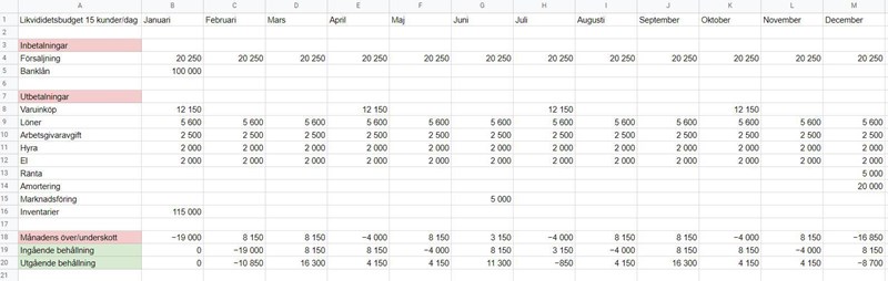 PS. En likviditetsbudget kan inte resultera i att företaget har "minuspengar" i kassan.