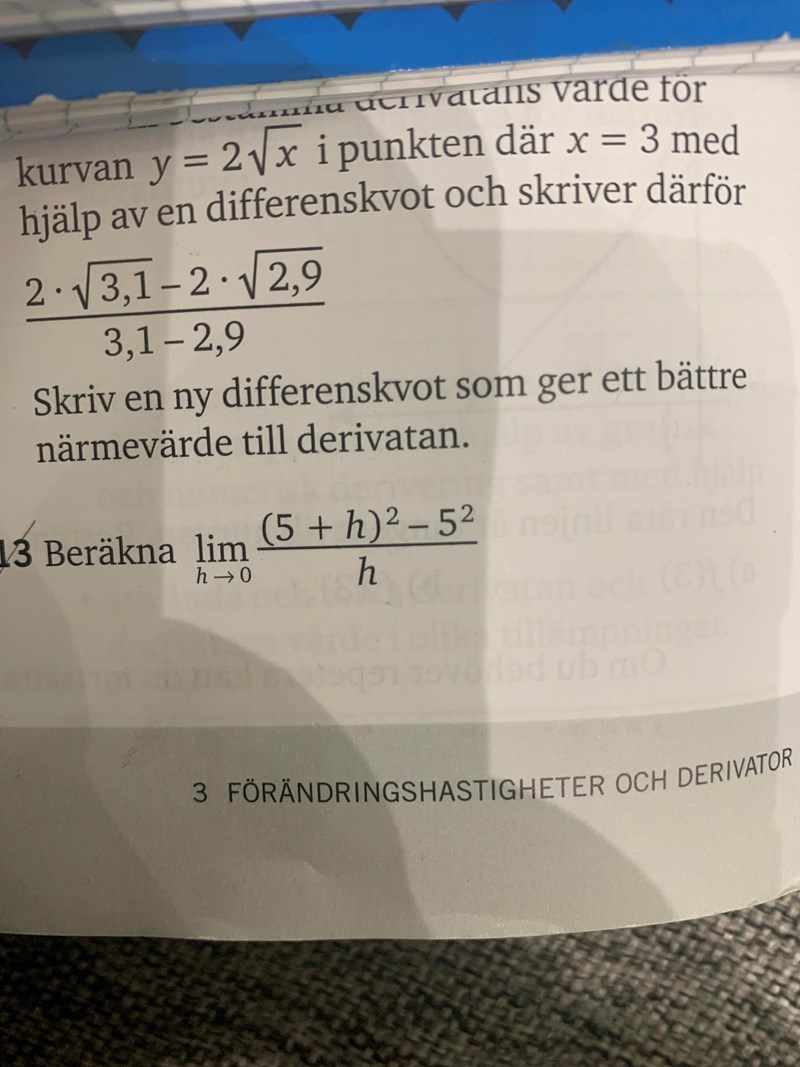 Frågan står i ett kapitel som handlar om förändring och derivator, vilket framgår av kapitelnamnet som står längst ner på sidan. Så det kanske hade viss påverkan på vår tolkning av frågan. Men det går naturligtvis att lösa detta som en ren gränsvärdesuppgift, men då tappar man ju helt kopplingen till vad kapitlet verkar handla om.