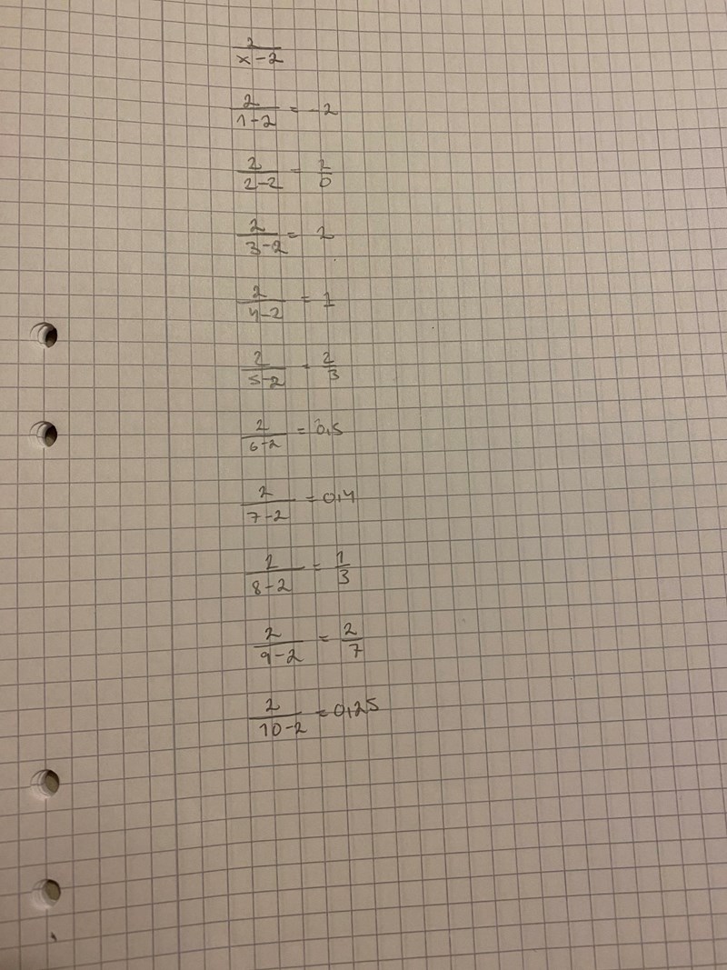 Jo börjar förstå. Boken förklarar inte det så bra vilket är anledningen till att jag inte fattar något. Men då förstår ju varför 4/x blir 0 när x går mot ♾. Hur blir det med denna funktion f(x)=2/(x-2) ?