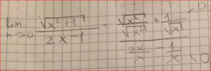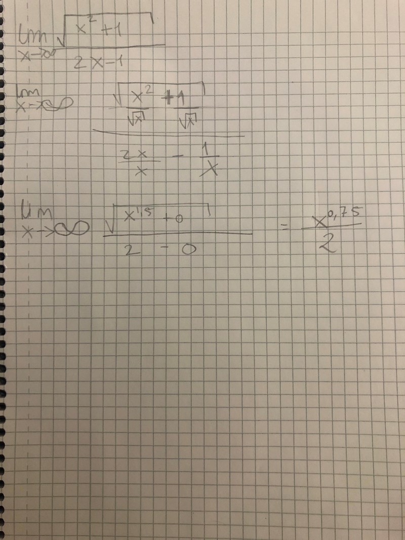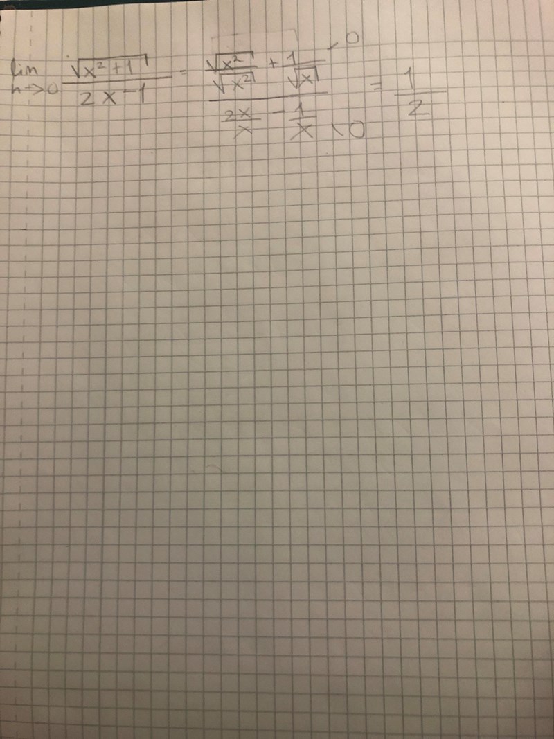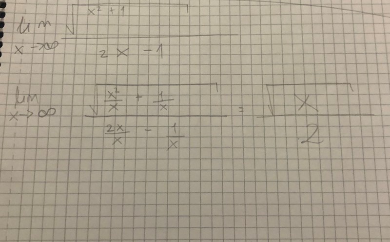 xx->\infty så går detta uttryck mot 1+02-0=12=12\frac{\sqrt{1+0}}{2-0}=\frac{\sqrt{1}}{2}=\frac{1}{2}