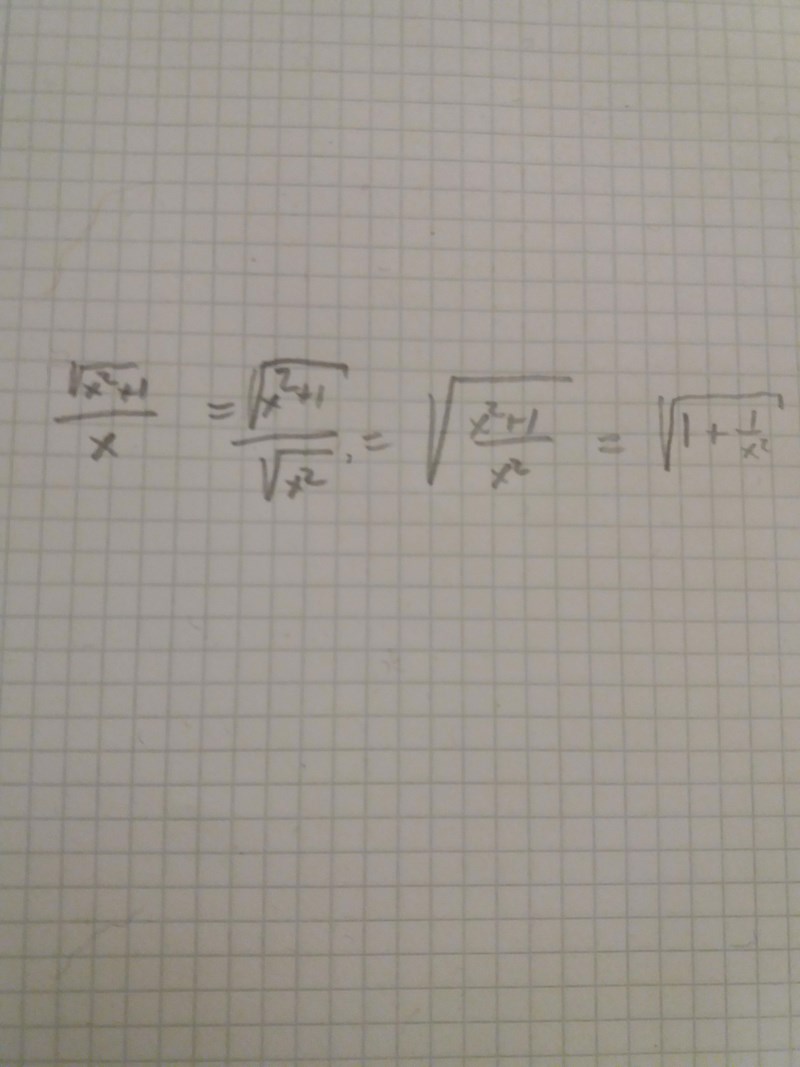 Istället gäller det att x2+1x=x2+1x2=x2+1x2\frac{\sqrt{x^2+1}}{x}=\frac{\sqrt{x^2+1}}{\sqrt{x^2}}=\sqrt{\frac{x^2+1}{x^2}}