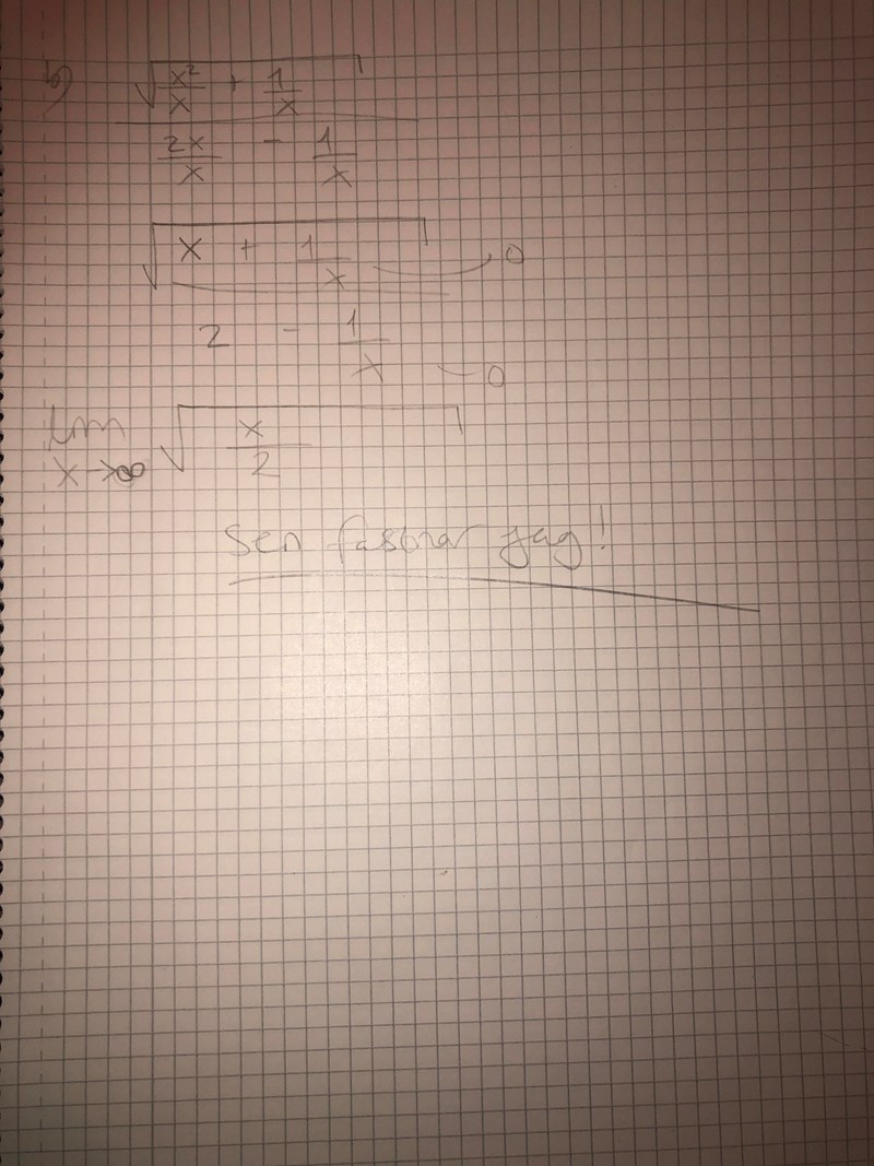 Sen gör du en algebraisk miss när du skriver att täljaren är x2x2+1x\frac{\sqrt{x^2}}{\sqrt{x^2}}+\frac{1}{\sqrt{x}}.