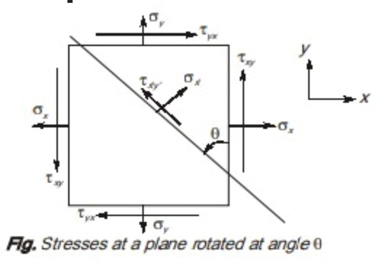 Här har man tagit fram spänningarna i ett koordinatsystem roterat moturs. Här ser du att normalspänningen är i x'-led och skjuvspänningen är i y'-led.
