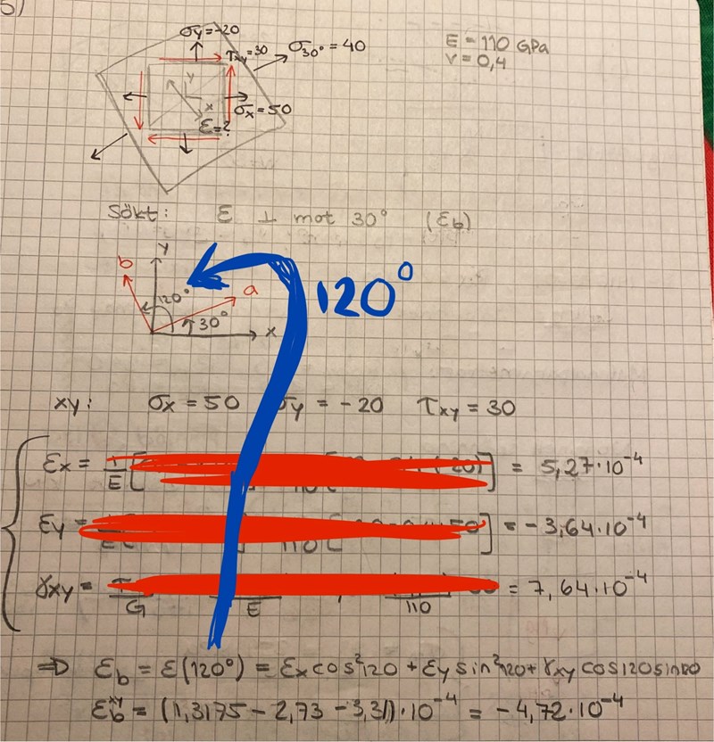 Ja, fast skjuvspänningar är inte längs med x'-axeln. De har alltid riktning längs med y'-axeln. Normalspänningar är längs med x'-axeln och dessa vill du ha normala till fogen. Alltså vill du rotera systemet -30 grader eller 150 grader.