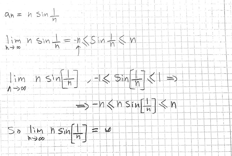 Sinuset går mot noll för stora n. Så hela uttrycket måste också gå mot noll, men jag får