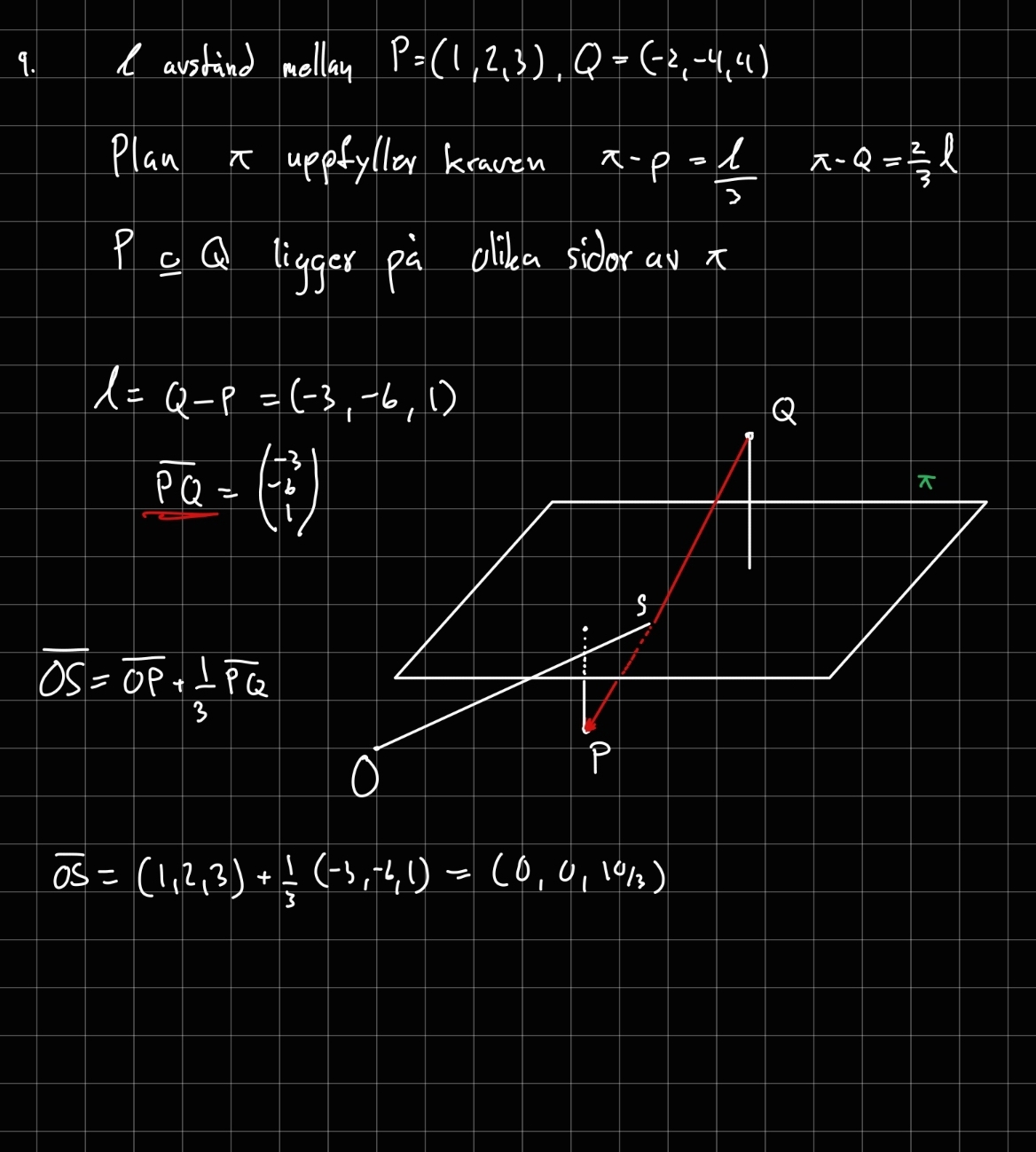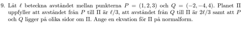 Jag måste nog be om ursäkt, tänkte inte fullt ut,  men avståndet från en punkt till ett plan är ju det vinkelräta avståndet till planet och om det är l/3 från den ena punkten och 2L/3 från den andra så måste vektorn PQ vara normalen.