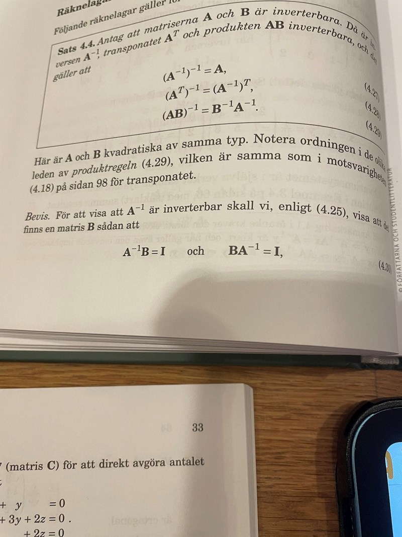 Se beviset av satsen som säger att (AB)-1=B-1A-1 längst ned på översta bilden och högst upp på nedersta bilden. Är det inte det resonemanget som jag frågade om tidigare som de använder för att visa att A=B?
