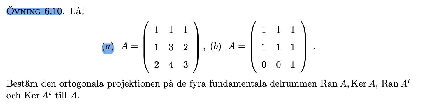 Idé för RanA: Gauss tills man hittar pivot elementen, blir 2 i detta fall. Ortogonalisera vektorerna med gram schmidt. Projicera vektorerna i matrisen mha ortogonal dekomposition. Får dock inte till det enligt facit, vad missar jag?